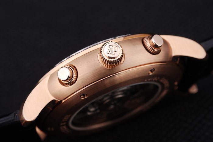 Crown : rosa de 18 quilates chapado en oro de la corona calado con el logotipo de Audemars Piguet y dos coronas con teclas más pequeñas a cada lado de it