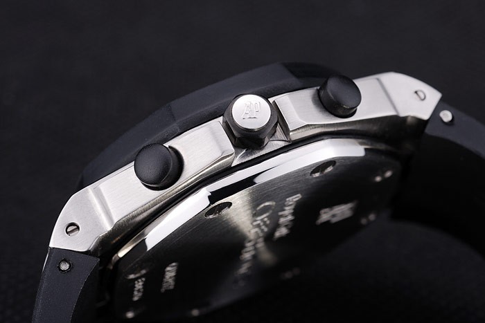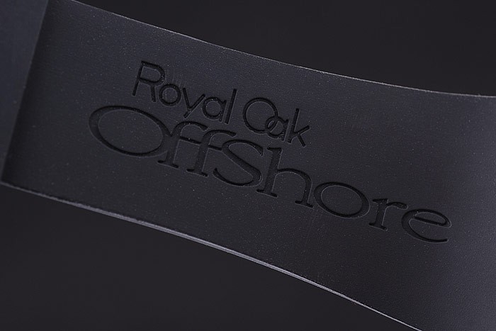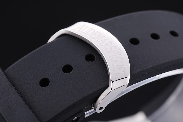 Bracelet: correa de caucho Negro con relieve de calor sello Audemars Piguet Royal Oak Offshore y un Audemars Piguet inscrito inoxidable acero abatible sobre el gancho clasp