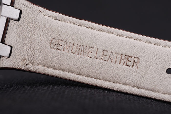 Bracelet: correa de piel de cocodrilo marrón con costuras de hilo blanco y en relieve de calor nombre de Audemars Piguet y el logotipo y un Audemars Piguet inscriben acero inoxidable flip-sobre el gancho clasp