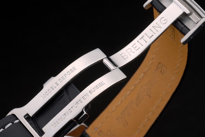 Bracelet de acero inoxidable: correa de cuero Breitling de calor en relieve de cocodrilo negro con costuras de hilo blanco y el logotipo grabado, pulido plegable en acero inoxidable clasp