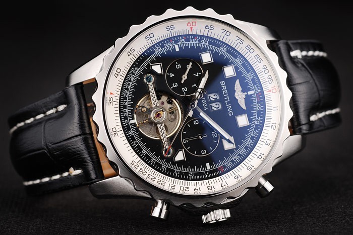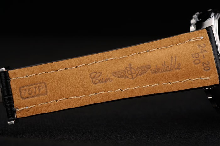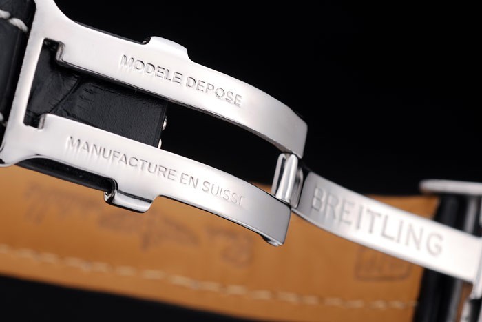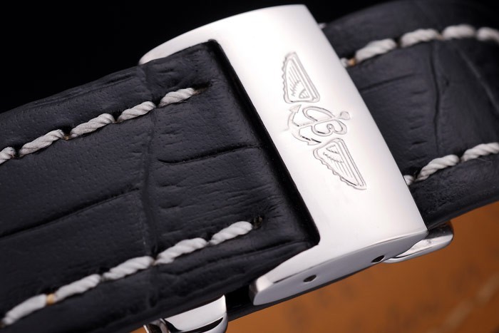 Bracelet de acero inoxidable: El calor en relieve nombre de Breitling y logotipo de la correa de cuero de cocodrilo negro con pespuntes de hilo blanco y el logotipo grabado de acero plegable en acero clasp