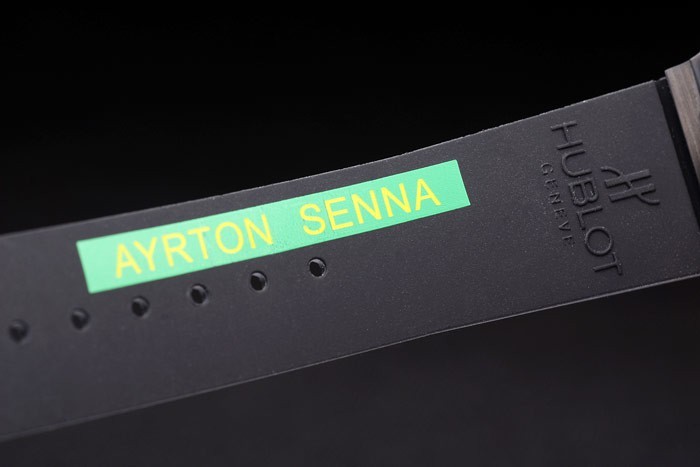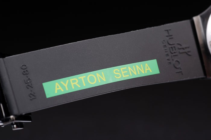 Bracelet de acero inoxidable: acanalado correa de caucho negro con Hublot Geneve en relieve en el interior junto con el verde sello de Ayrton Senna y cierre plegable gancho de la hebilla con Hublot Geneve engraving