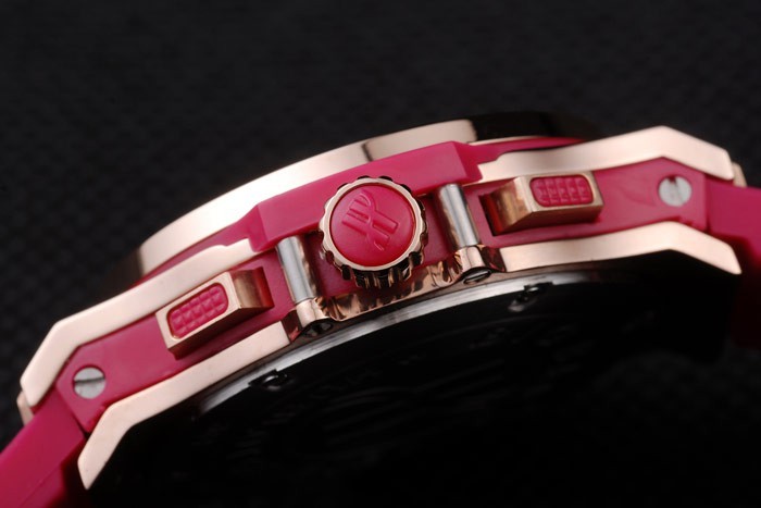 Crown: Cutwork corona de oro rosa con el grabado y dos rectangulares ‘H’ PULSADOR coronas a cada lado, todas tachonada con goma de color rosa trimmings