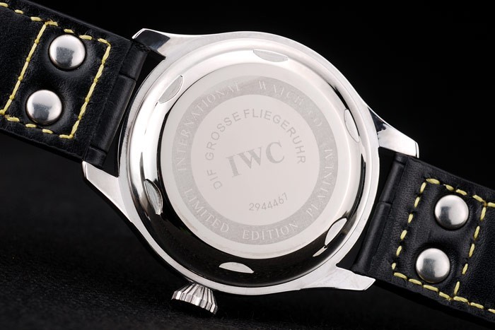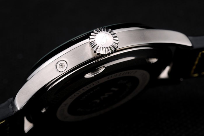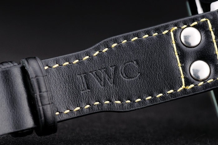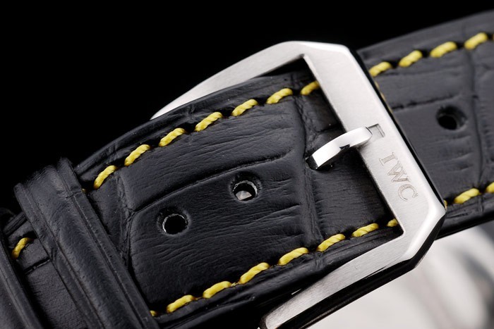 Bracelet acero inoxidable cepillado: Correa CBI calor en relieve de cocodrilo negro de cuero con costuras de hilo amarillo y grabado de acero inoxidable cepillado de gancho CBI clasp