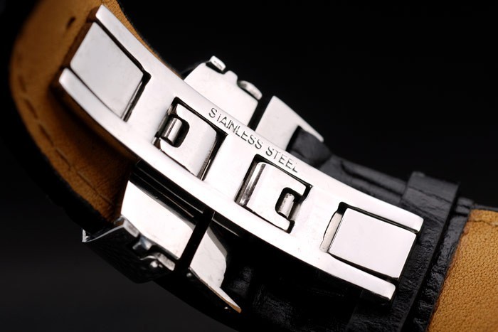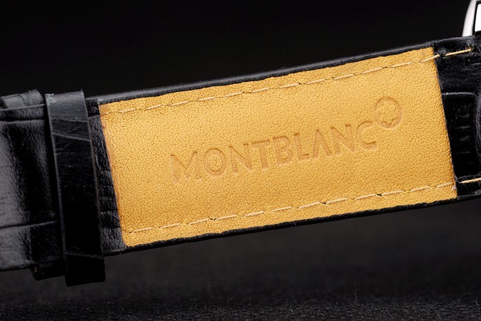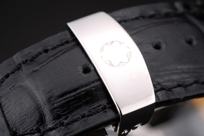 acero inoxidable pulido correa de cuero MontBlanc calor en relieve de cocodrilo negro con el logo MontBlanc inscrito: Volver: Acero inoxidable pulido snap-in de nuevo con el centro transparente y MontBlanc grabado y logo