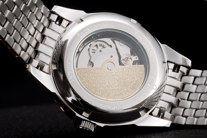 Volver: Acero inoxidable de empuje en el caso de vuelta con inscripciones Omega y transparencia en el centro revela que la mecánica within