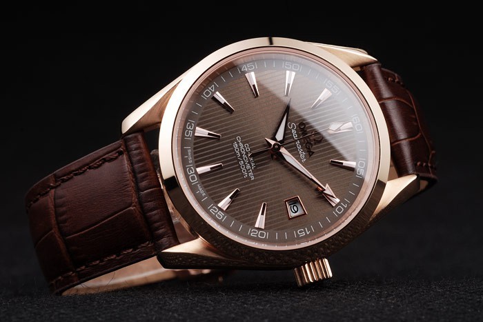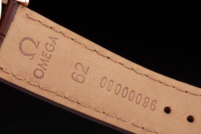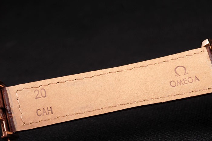 Bracelet: correa de piel de cocodrilo marrón con relieve de calor sello de Omega y Omega inscrito 18k oro rosa plegable en clasp