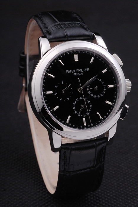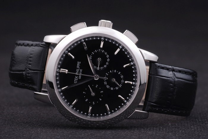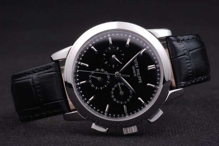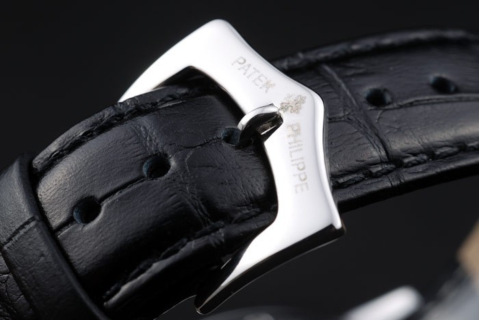 Bracelet de acero inoxidable: correa de cuero Negro con el sello de Patek Philippe y un pliegue de acero inoxidable en clasp