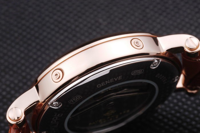 Crown: Rose corona de oro con el logotipo de Patek grabado y dos coronas más pequeñas a ambos side