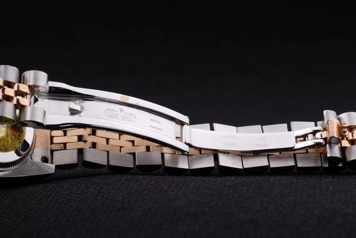 Bracelet de acero inoxidable: Dos brazalete de eslabones de tonos de acero inoxidable pulido y oro amarillo de 18K chapado en acero con cierre oculto grabado Rolex mostrando la longitud Rolex logo