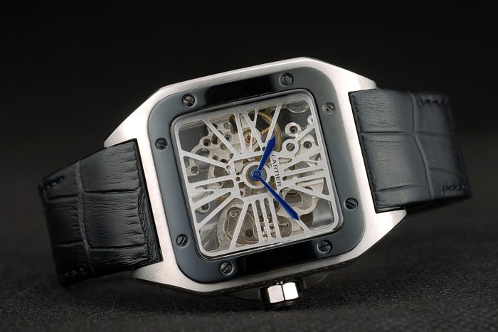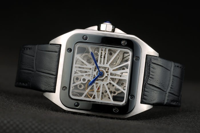 Bracelet: calor correa de piel de cocodrilo negro en relieve Cartier de acero inoxidable cepillado complemento broche mediante botón pulsador de la longitud side