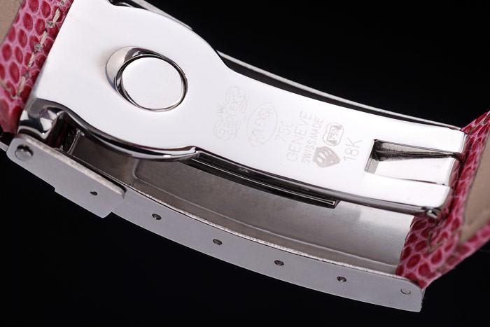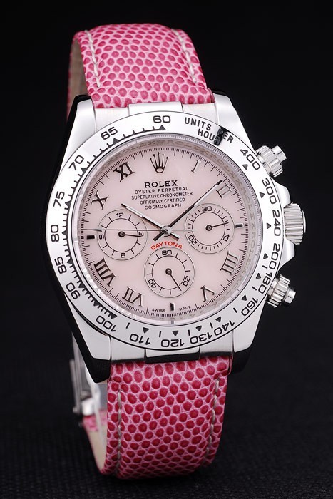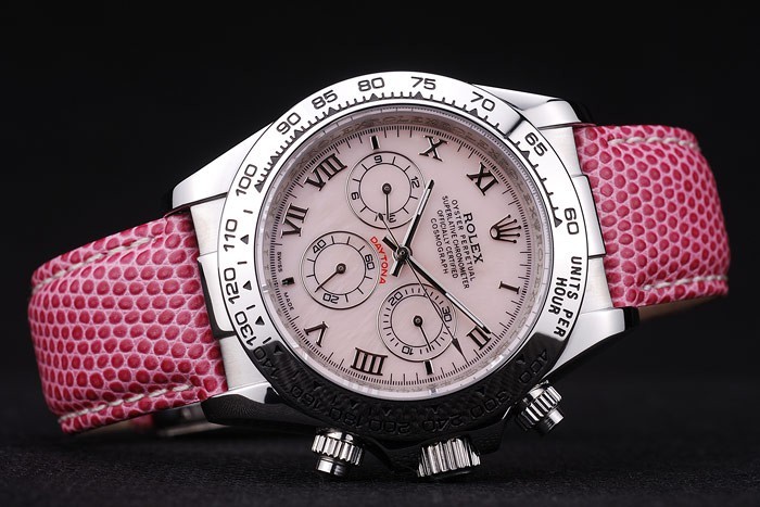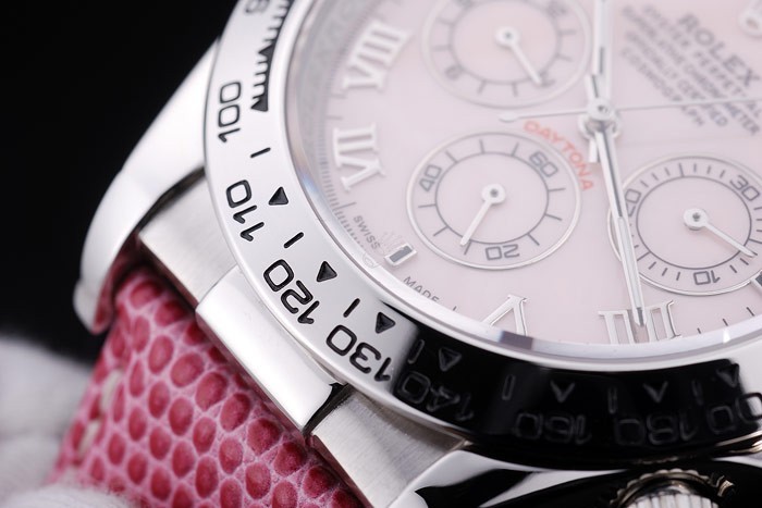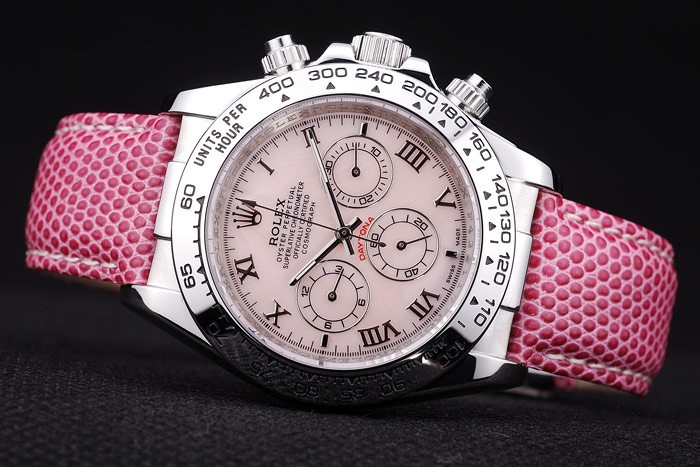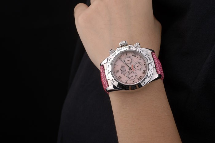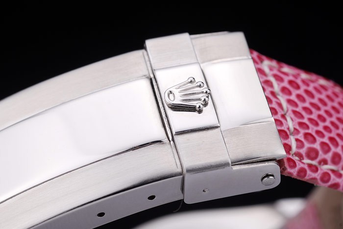Bracelet: correa de piel de serpiente rosada con Rolex y el logotipo grabado y cierre desplegable de acero inoxidable donde se presentan Rolex logo