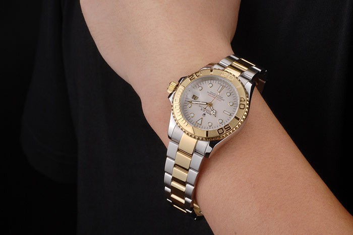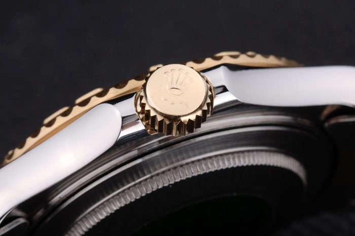 Bracelet: Dos tonos brazalete de eslabones de acero inoxidable cepillado y tono de oro con el grabado Rolex doblar por la hebilla mostrando el Rolex logo