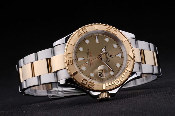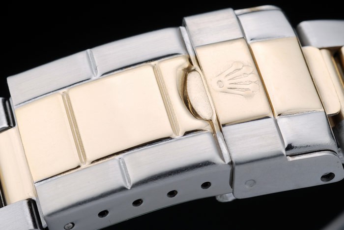 Bracelet: Dos tonos brazalete de eslabones de acero inoxidable cepillado y tono de oro con el grabado Rolex doblar por la hebilla mostrando el Rolex logo